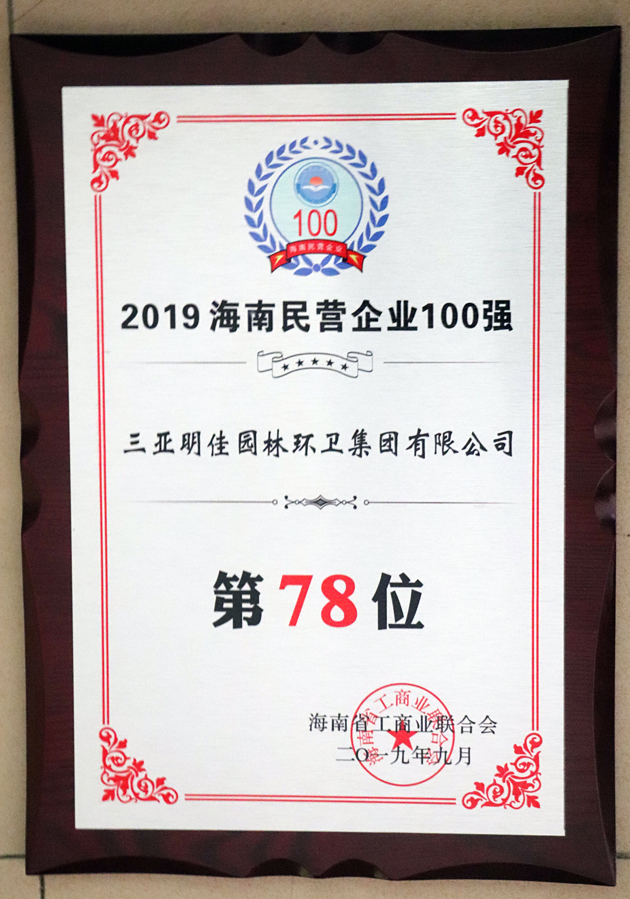 海南省工商聯(lián)24日在?诎l(fā)布2019海南省民營企業(yè)100強(qiáng),三亞明佳園林環(huán)衛(wèi)集團(tuán)有限公司名列第78位。