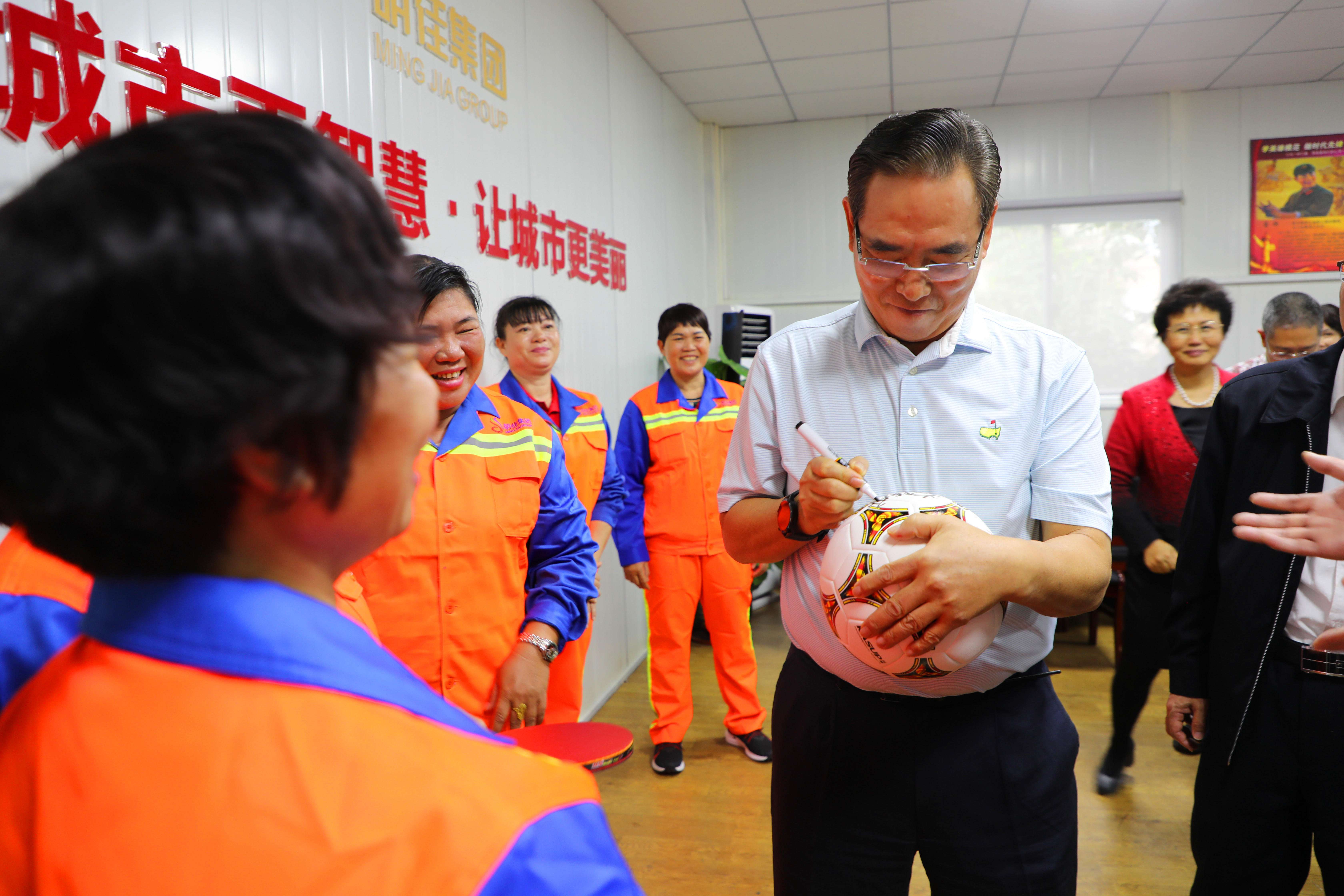 座談會結(jié)束后,明佳集團(tuán)一些職工表示非常喜愛乒乓球及足球運(yùn)動,一直都是蔡副主席的粉絲,希望獲得蔡振華副主席的親筆簽名。蔡副主席非常親切地為他們簽名,并與之合影留念。