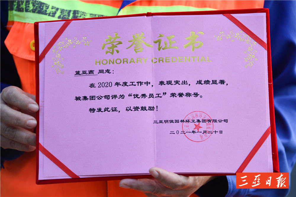 “亞燕是一個(gè)工作負(fù)責(zé)、認(rèn)真的員工,她工作讓我很放心,平時(shí)她還主動(dòng)幫助其他工人,累活也搶著干!泵骷循h(huán)衛(wèi)天涯一隊(duì)隊(duì)長(zhǎng)林海菊這樣評(píng)價(jià)藍(lán)亞燕。
