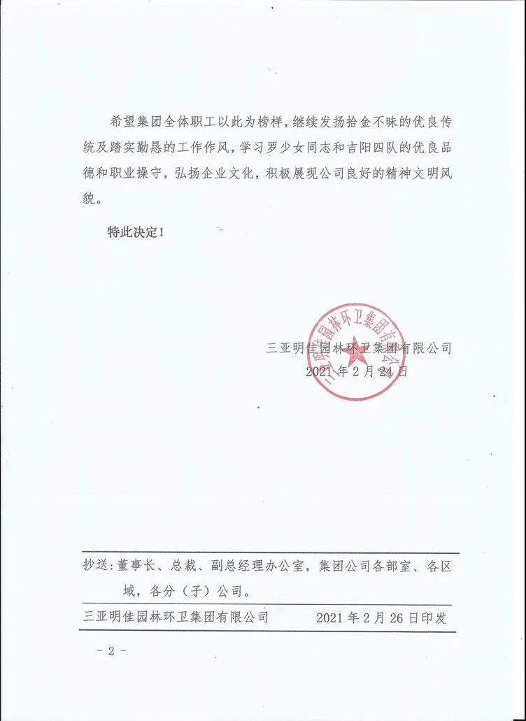 為表彰羅少女同志拾金不昧的精神,三亞明佳園林環(huán)衛(wèi)集團(tuán)有限公司于2021年2月25日 15:30時(shí),在集團(tuán)公司三樓會議室召開拾金不昧表彰大會。明佳集團(tuán)黨支部書記、董事長陳明,黨支部副書記、總裁陳云及20名員工代表參加會議。